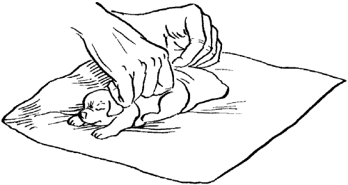 Если дыхание щенка затруднено, следует взять его в руки и, удерживая пальцами голову малыша, несколько раз быстро встряхнуть его тельце в направлении сверху вниз. Таким образом можно очистить дыхательные пути щенка от остатков слизи, препятствующей нормальному дыханию. Для стимуляции дыхательного процесса рекомендуется также сделать новорожденному массаж, осторожно нажимая ладонью на область ребер. Если это не помогает, то можно намочить затылочную часть головы щенка холодной водой, снова выполнить массаж, а затем энергично растереть все тело малыша куском сухой чистой ткани или полотенцем.