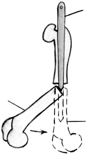 Остеосинтез бедренной кости металлическим штифтом: 1 – штифт; 2 – смещенный отломок до имплантирования; 3 – тот же отломок после придания ему правильного положения и введения штифта