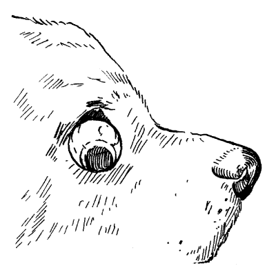 Это заболевание может развиться, если собака перенесла травму головы. Вероятность выпадения глазного яблока повышает незамкнутость костной орбиты. После выпадения глазное яблоко ущемляется веками, конъюнктива отекает в краткосрочный период и нависает над роговицей в виде валика, сама же роговица высыхает и теряет блеск. Глаз выглядит выпученным. Если не вправлять выпавшее глазное яблоко больше суток, эпителий его дегенерирует, появляются участки некроза и язвы на роговице. В результате у питомца наступает полная слепота.