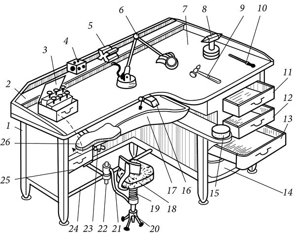 Рис. 1. Универсальный ювелирно-граверный верстак: 1 – каркас; 2 – полочка; 3 – коробка с набором штихелей; 4, 5 – призмы; 6 – шарнирно-поворотная электролампа с линзой; 7 – столешница; 8 – настольная наковальня; 9 – место расположения молотков; 10 – место расположения напильников; 11–14 – выдвижные ящики; 15 – круглая наковальня; 16 – фенагель; 17 – выдвижной сборник; 18 – сиденье со спинкой; 19 – спиральная пружина стула; 20 – тренога стула; 21 – труба кронштейна; 22 – ось консоли; 23 – подъемно-регулировочный винт подлокотника; 24 – опора для ног (труба); 25 – коробка с инструментом; 26 – подлокотник.
