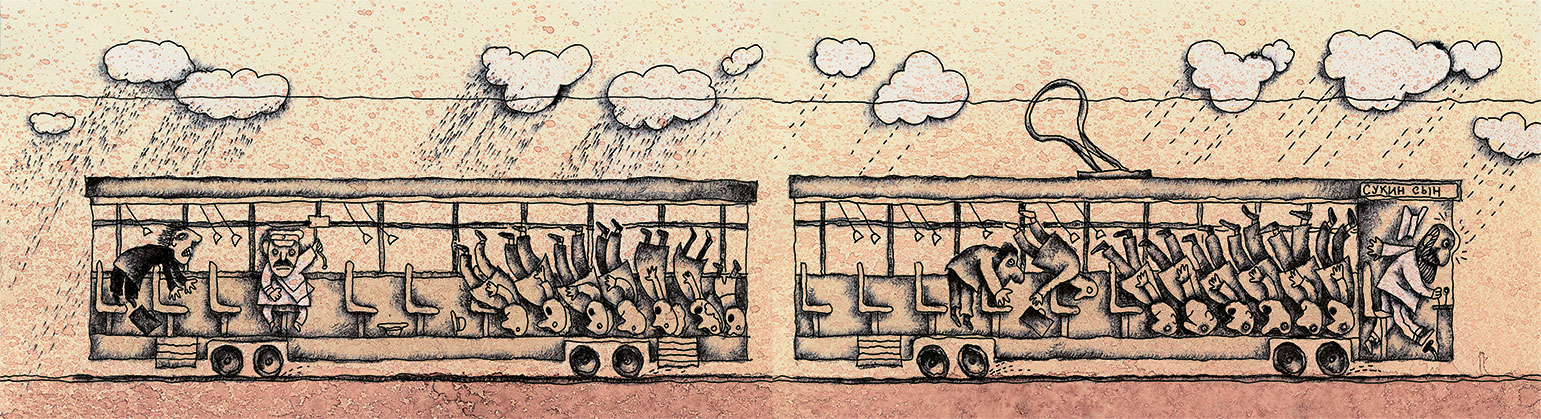 В окнах проплывают Биржевой мост, Нева и сундук. Трамвай останавливается, все падают вперед и хором произносят: «Сукин сын!»
