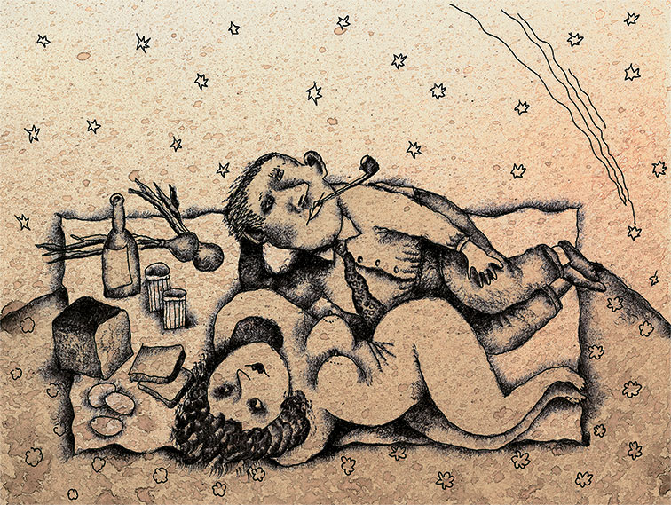 ШАШКИН (стоя посреди сцены): У меня сбежала жена. Ну что же тут поделаешь? Все равно, коли сбежала, так уж не вернешь. Надо быть философом и мудро воспринимать всякое событие. Счастлив тот, кто обладает мудростью. Вот Куров этой мудростью не обладает, а я обладаю. Я в Публичной Библиотеке два раза книгу читал. Очень умно там обо всем было написано. Я всем интересуюсь, даже языками. Я знаю по-французски считать и знаю как по-немецки живот. Дер маген. Вот как! Со мной даже художник Козлов дружит. Мы с ним вместе пиво пьем. А Куров что? Даже на часы смотреть не умеет. В пальцы сморкается, рыбу вилкой ест, спит в сапогах, зубов не чистит… тпфу! что называется мужик! Ведь с ним покажись в обществе: вышибут вон, да еще и матом покроют: не ходи, мол, с мужиком, коли сам интеллигент. Ко мне не подкопаешься. Давай графа – поговорю с графом. Давай барона – и с бароном поговорю. Сразу даже не поймешь, кто я такой есть.