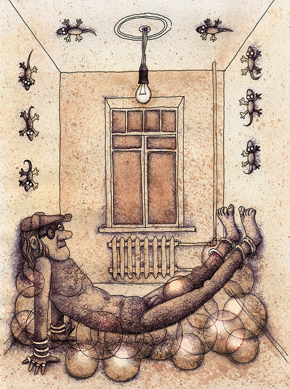 Я поднял пыль. Дети бежали за мной и рвали на себе одежду. Старики и старухи падали с крыш. Я свистел, я громыхал, я лязгал зубами и стучал железной палкой. Рваные дети мчались за мной и, не поспевая, ломали в страшной спешке свои тонкие ноги. Старики и старухи скакали вокруг меня. Я несся вперед! Грязные, рахитичные дети, похожие на грибы поганки, путались под моими ногами. Мне было трудно бежать. Я поминутно спотыкался и раз даже чуть не упал в мягкую кашу из барахтающихся на земле стариков и старух. Я прыгнул, оборвал нескольким поганкам головы и наступил на живот худой старухи, которая при этом громко хрустнула и тихо произнесла: «замучили». Я не оглядываясь побежал дальше. Теперь под моими ногами была чистая и ровная мостовая. Редкие фонари освещали мне путь. Я подбегал к бане. Приветливый банный огонек уже мелькал передо мной и банный уютный, но душный пар уже лез мне в ноздри, уши и рот. Я, не раздеваясь пробежал сквозь предбанник, потом, мимо кранов, шаек и нар, прямо к полку. Горячее, белое облако окружило меня. Я слышу слабый но настойчивый звон. Я кажется лежу.
