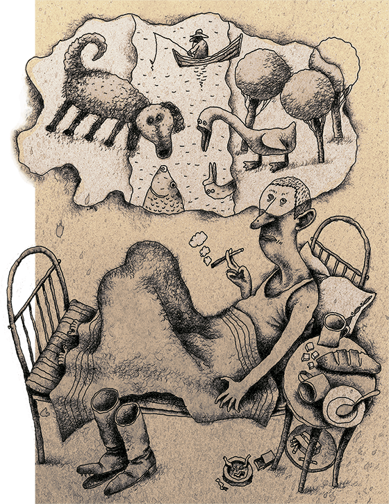 Я не могу заснуть. Я стараюсь ни о чем не думать, Я вспоминаю что это невозможно и стараюсь не напрягать мысли. Пусть думается о чем угодно. Вот я думаю об огромной ложке и вспоминаю басню о татарине, который видел во сне кисель, но забыл взять в сон ложку. А потом увидел ложку, но забыл… забыл… забыл… Это я забыл о чем я думал. Уж не сплю ли я? Я открыл для проверки глаза.