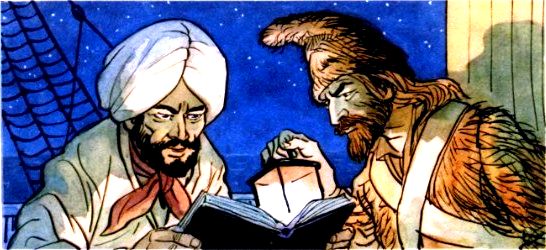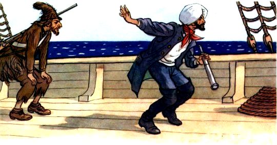 — Всё ясно! — довольно усмехнулся Робинзон. — На горизонте появилось пиратское судно. Пираты взяли шхуну на абордаж, а всю команду обратили в рабство, как случилось в молодости со мной.