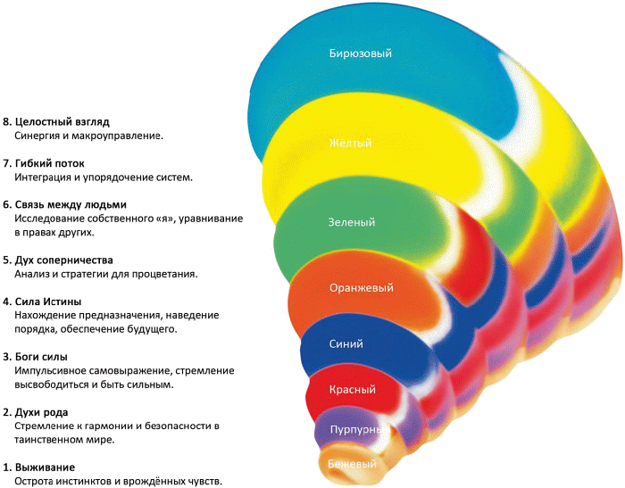 Рис. 1.1. Спираль развития. Используется с разрешения Дона Бека и Кристофера Кована, заимствовано из их книги: «Спиральная динамика: Управляя ценностями, лидерством и изменениями» (Cambridge, Mass.: Blackwell Publishers, 1995)