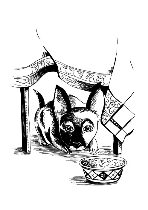 Чёрно-белая дворняжка встрепенулась и собралась было поднять лай, но мужчина встал из-за стола и замахнулся на неё кулаком: