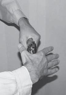 Часто бывает так, что при извлечении оружия по разным причинам его не удалось сразу взять в правильный хват. Тут возникает необходимость в одно движение перехватить оружие правильно, «добить в руке». Для отработки этого элемента поместите оружие за пояс под рабочую руку. Большим и указательным пальцами захватите пистолет за середину рукояти, вытяните из-за ремня и удерживайте на весу на уровне пояса. Затем резким движением руки вперед, используя инерцию оружия, ударьте его в затыльник вилкой из большого и указательного пальцев и захватите на лету правильным хватом.