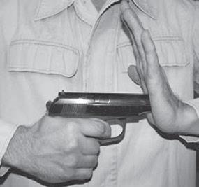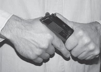 Далее левой рукой попробуйте вырвать пистолет за ствол из правой руки. Направляйте усилие в разные стороны. Следите за тем, как пистолет ведет себя в руке: он должен сидеть в кисти плотно и не смещаться, не менять своего положения.