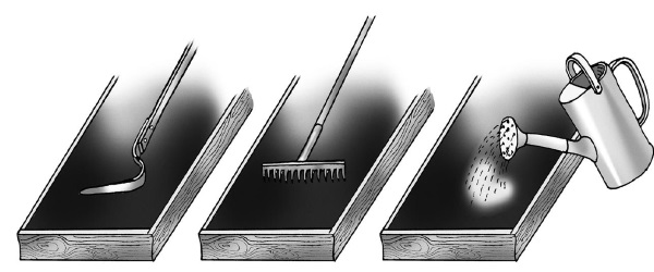 Почву на грядке слегка прорыхлить плоскорезом Фокина, не глубже чем на 5–7 см. Разбороновать граблями. От души полить водой.