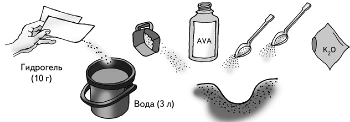Внести в каждую лунку столовую ложку не содержащего хлор калия и на кончике столовой ложки – порошковую фракцию удобрения AVA, вылить не менее одного литра теплой (25–28 градусов) воды. Дополнительно внести в лунку полстакана разведенного водой гидрогеля и присыпать сверху почвой на 4–5 см. Слегка уплотнить почву. Гидрогель разводят водой в 300 раз за 5–6 часов до посадки.