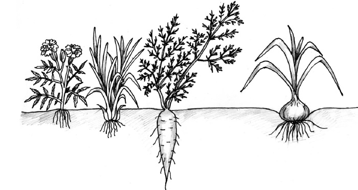 Лучше сразу на одной грядке сеять морковь, лук-чернушку и севок, а по периметру грядки по самому краю посеять семена низкорослых бархатцев.