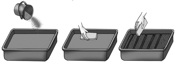Уплотнить почву плоской стороной дощечки или столовой ложкой. Сделать разделительные борозды через 7 см глубиной 3 см.