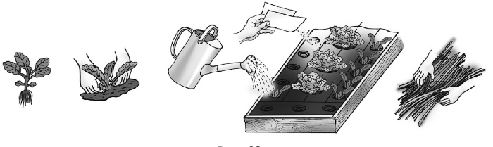 Подготовить грядку для посевов редиса. Сеять редис надо сразу разреженно, по схемам 4 x 4 или 5 x 5 см (рис. 69) для обычных сортов и 10 x 10 см для редисов-гигантов. Если посевы слишком загущены, рассадите редис. Он, как и все круглые корнеплоды, легко переносит пересадку в возрасте 2–3 настоящих листов.