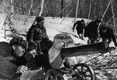 Советские солдаты во взаимодействии с партизанами ведут бой за населенный пункт