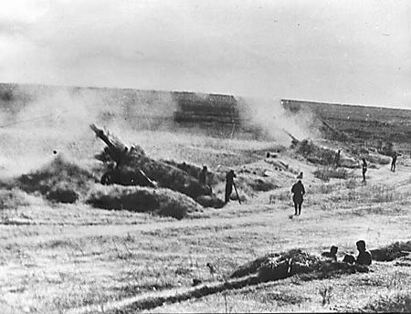 Тяжелая артиллерия Советской Армии ведет огонь по противнику