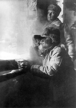 Советские офицеры ведут наблюдение за противником на командном пункте штаба артиллерии 138-й стрелковой дивизии.