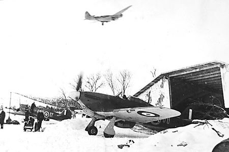 Советский бомбардировщик СБ пролетает над стоящими на аэродроме английскими истребителями «Харрикейн» Мк IIB Trop