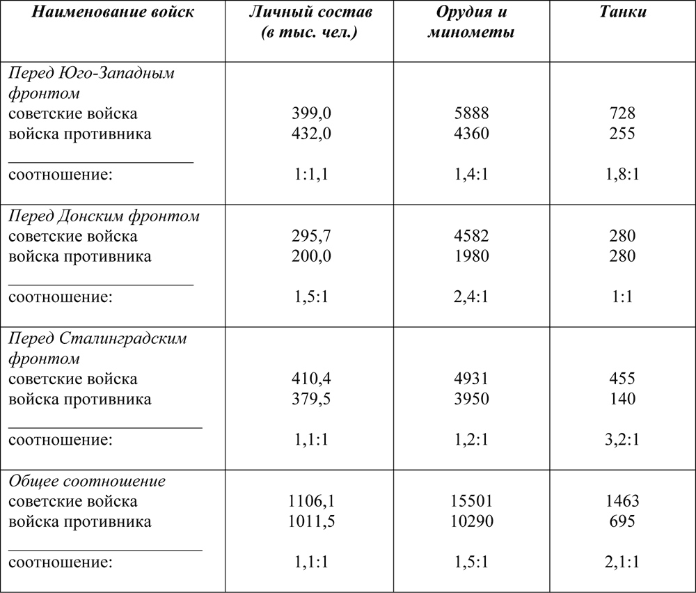 Из таблицы следует, что советские войска превосходят противника особенно в артиллерии и танках, что при контрнаступлении имеет решающее значение.