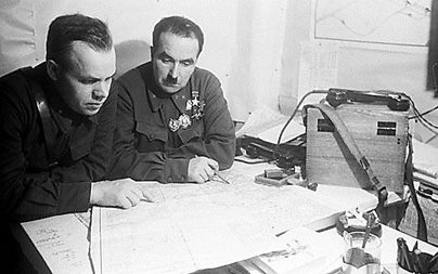 Заместитель командующего Волховского фронта, генерал-майор, Герой Советского Союза И. И. Федюнинский (справа) и бригадный комиссар Д. Холостов за обсуждением оперативного плана.