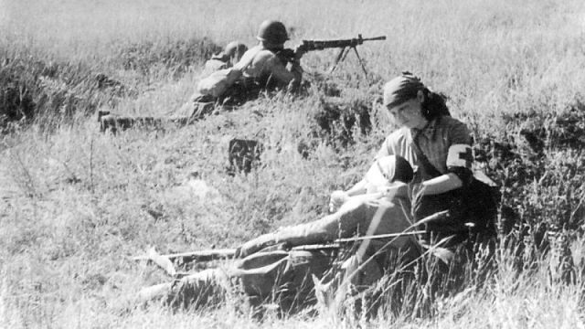 Медсестра В. Смирнова на поле боя оказывает помощь раненому бойцу