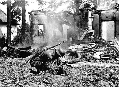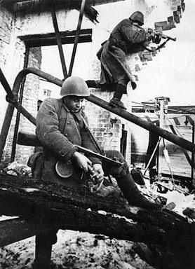 Советские солдаты ведут бой в руинах сталинградских домов.