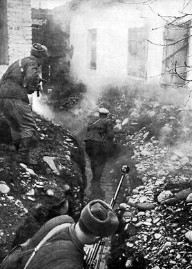 В атаку поднимаются наши части. Их атаку поддерживает артиллерия фронтовой артиллерийской группы и авиации. Отсутствие самолетов противника облегчает советским воинам задачу. Правда, авиация уже не играет решающей роли в уличных боях (к. 40).