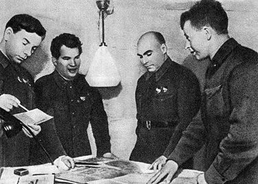 В штабе 62-й армии. Слева направо: Н. И. Крылов, В. И. Чуйков, К. А. Гуров, А. И. Родимцев. Сталинград, осень 1942 г.