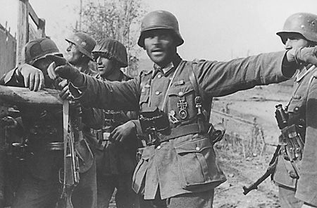 Гауптман Фридрих Винклер (в центре) ставит боевую задачу солдатам 305-й пехотной дивизии в районе сталинградского завода «Баррикады».
