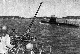 Подводная лодка «Щ-310» («Белуха») в сопровождении морского охотника возвращается из боевого похода