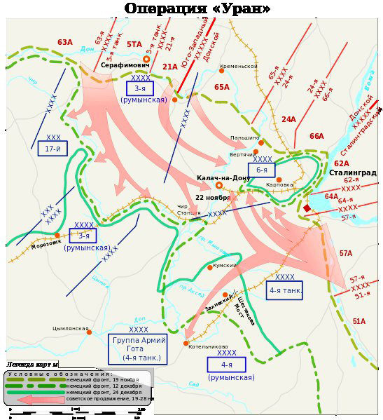 Контрнаступление запланировано как стратегическая операция трех фронтов – Юго-Западного, Донского и Сталинградского. Оно должно развернуться одновременно на 400-километровом фронте. Советские войска охватывают в клещи силы противника на территории радиусом около 100 километров. При этом создастся одновременно два фронта окружения – внутренний и внешний.