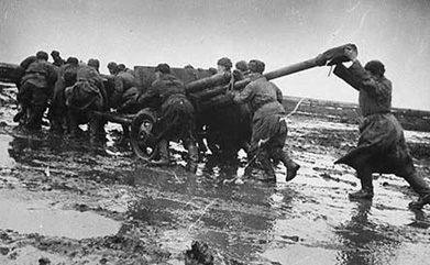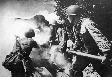 Артиллерийский расчет Красной Армии ведет огонь по противнику.