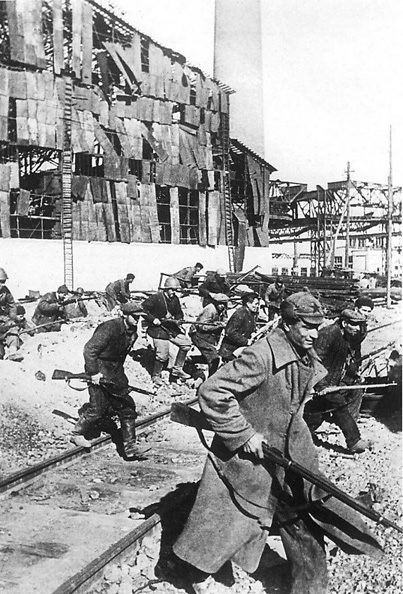 Ополченцы Сталинградского тракторного завода идут к месту боев в городе.