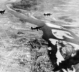 Немецкие пикирующие бомбардировщики Юнкерс Ю-87 в небе над горящим Сталинградом.