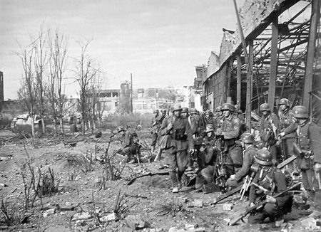 Немецкие солдаты у разрушенных боями и бомбардировками зданий Сталинградского тракторного завода. Слева видна немецкая САУ StuG III.