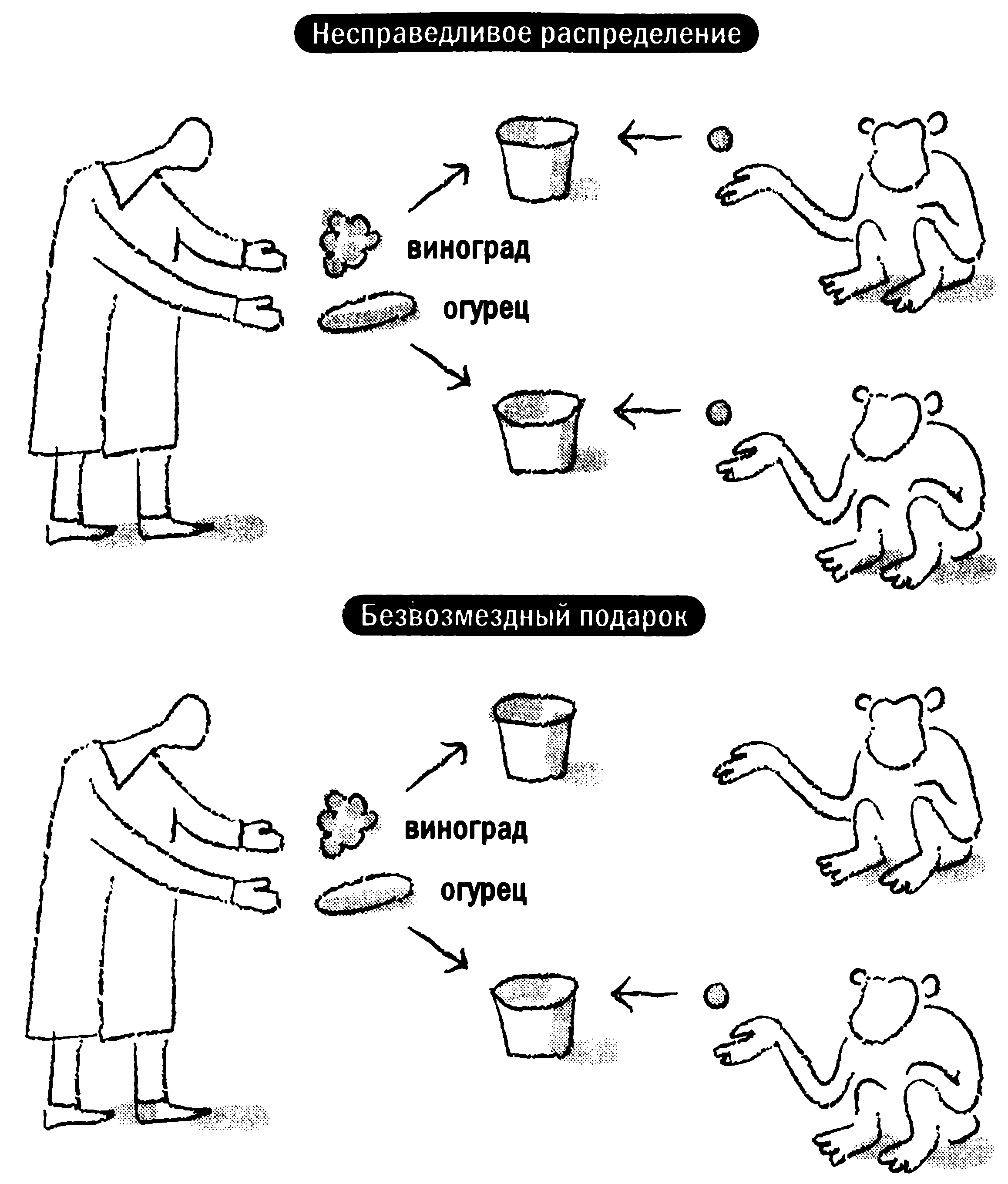 В отличие от обмена едой у людей или у других животных, шимпанзе и капуцины, играющие в эти игры, ничего не платили за свои жетоны. Поэтому, может быть, называть такое взаимодействие «обменом» — это преувеличение. Особи отдают свои жетоны, но это действие не отличается от того, как особь выбирает нужный ключ, чтобы получить взамен еду. Если такой выбор не делается, крысы и голуби не получают еды. Если шимпанзе и капуцины не отдают камушек или трубочку, они не получают еды. В естественных условиях оба вида никогда не производят таких обменов, которые придумали Броснан и де Ваал. Ни у одного из видов нет ничего подобного той системе обмена, которая была создана в этих экспериментах. На самом деле в дикой природе шимпанзе толерантно относятся к тому, что другая особь возьмет еду, особенно во время охоты. И, как упоминалось в последнем разделе, те, кто разрешает взять больше еды, стремятся получить больше внимания к себе (ухода за собой). Что касается капуцинов, живущих на воле, есть лишь немного данных относительно того, что они делятся едой, и нет никаких данных об этом в контексте совместного взаимодействия или взаимовыгодного обмена. Согласно экспериментальным данным, только самки участвуют в этом виде обмена, но нет данных о реакции на несправедливость в парах, состоящих либо из двух самцов, либо из самца и самки. Важным является и несоответствие между поведением в экспериментальных условиях и спонтанным поведением в естественных условиях. То, что в неволе эти животные, оказывается, реагируют на нечто, подобное несправедливости, показывает, что при определенных условиях включается психологический фактор. Это важное открытие. Но оно ставит очень сложные вопросы, касающиеся того, как эта способность возникла, в каком контексте и при каких условиях отбора она развивалась?