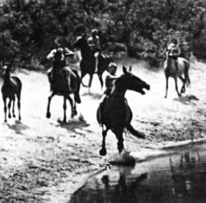 — Но почему же вечером они становятся рядом и глядят вон туда, где солнце прячется за стога, и речка прячется в лес, и лошади ходят в тумане?