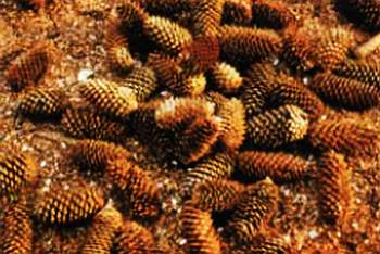 Против окна темнели еловые ветки с большими желтыми шишками.