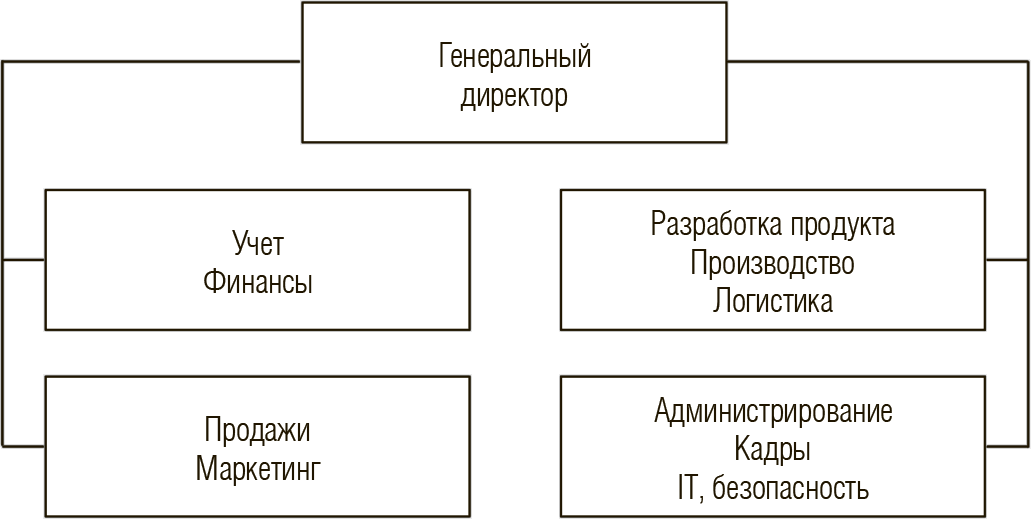 Переход к системному менеджменту, по мнению Ицхака Адизеса, должен осуществляться с помощью поэтапной реструктуризации компании. Традиционная структура организации (рис. 1) предполагает образование подразделений в соответствии с выполняемыми задачами: учет и финансы (возглавляет финансовый директор); продажи и маркетинг (коммерческий директор); R&D, производство, логистика (технический директор); администрирование, кадры, безопасность, IT (директор по персоналу). Главы четырех департаментов подчиняются непосредственно генеральному директору.