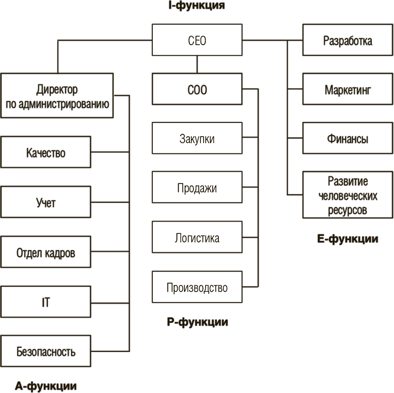 Объединив функции, соответствующие каждому витамину, можно сформировать отдельные департаменты, благодаря чему компания превратится в структуру, представленную на рис. 2. В ней выделяются три подразделения: 1) реализующее А-функции, во главе которого стоит директор по администрированию; 2) ответственное за Р-функции во главе с COO (Chief Operating Officer); 3) несколько отделов, выполняющих Е-функции (разработка, маркетинг, управление финансами и другие, связанные с творчеством и работой на долгосрочный результат), с разными руководителями, которые напрямую подчиняются основателю.