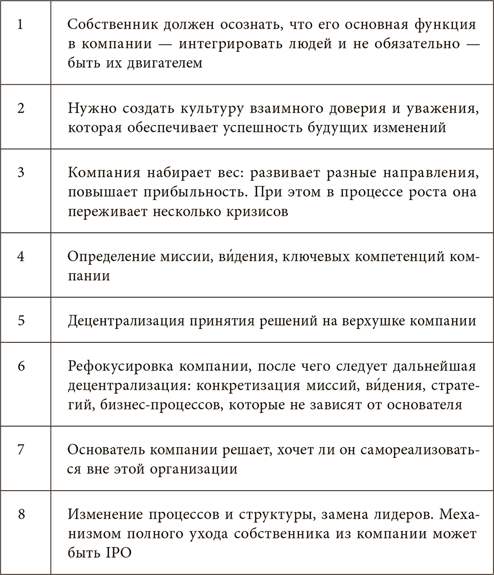 Итак, переход от предпринимательского менеджмента к системному – процесс длительный и начинается с собственника (табл. 1). Именно от него зависит, станет ли компания независимой. Однако нужно иметь в виду: только системная организация может достигнуть этапа расцвета и в полной мере раскрыть свой потенциал.