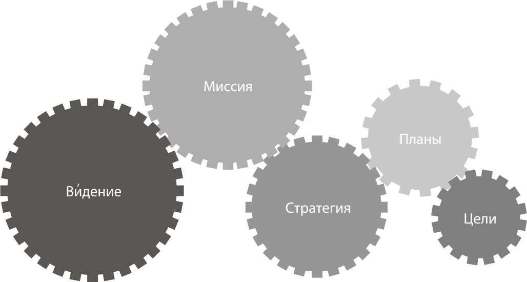 Видение компании – это ее стремление стать такой, какой она хочет стать. Миссия – ее коренная цель, причина, по которой она существует. То, кем мы хотим быть (видение), побуждает нас делать то, что мы делаем (миссия). Из миссии рождается стратегия, на основе которой строятся планы и устанавливаются текущие цели. Видение и миссия – это как главный привод в такой системе, как организация (рис. 1).