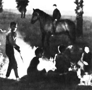 На крючьях висели связки лука и чеснока. Хор и танцоры мцхетской самодеятельности в этот вечер справляли победу на каком-то большом конкурсе в Тбилиси. Мы сейчас же были посажены за общий стол. Вино из бочки, грузинский сыр, кукурузная мамалыга, помидоры, шашлык, груши и какие-то травы…