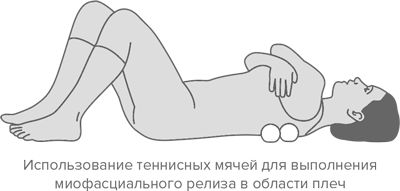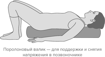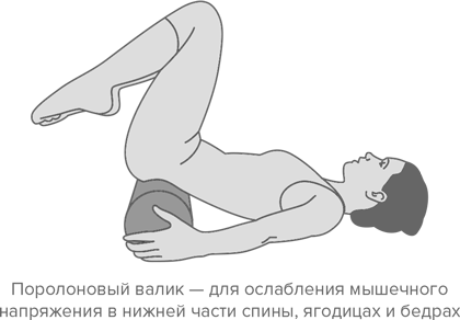 Для облегчения симптомов я бы рекомендовала поролоновый валик и теннисные мячи. Валик очень полезен от болей в нижней части спины, бедрах и голенях. Его также можно использовать для выпрямления позвоночника – просто лягте на него (см. иллюстрации ниже). Поролоновые валики продаются в большинстве спортивных магазинов или в Интернете. Теннисные мячи подойдут для массажа глубоких тканей в области шеи и плеч. Лягте на них и двигайтесь медленно вверх и вниз или по кругу. Их можно использовать на всех участках тела, как и валик. Это называется миофасциальный релиз (высвобождение). Я бы рекомендовала проделывать это хотя бы два раза в день, для начала – 5–10 минут, особенно если у вас имеются сильно напряженные участки или боли.