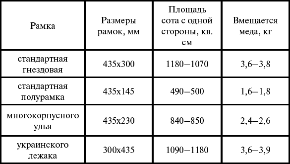 В нашей стране приняты единые стандартные рамки: гнездовые для 12-рамочных, двухкорпусных ульев и лежаков с наружными размерами 435 x 300 мм, магазинные – 435 x 145 (или на 150) мм, для многокорпусных ульев – 435 x 230 мм.