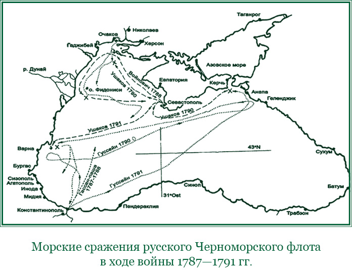 Этим ограничивались все сношения и зависимость. Потемкину предоставлено также было производить в чины до капитана 2 ранга. В составленном им тогда штате положено иметь на Черном море двенадцать линейных кораблей и двадцать фрегатов; однако обстоятельства войны и могущество Турции, владевшей большими ресурсами для многочисленного флота, указывали на необходимость соразмерения сил своих с предстоявшими в них потребностями, и Потемкин в 1790 году возымел следующие предположения: