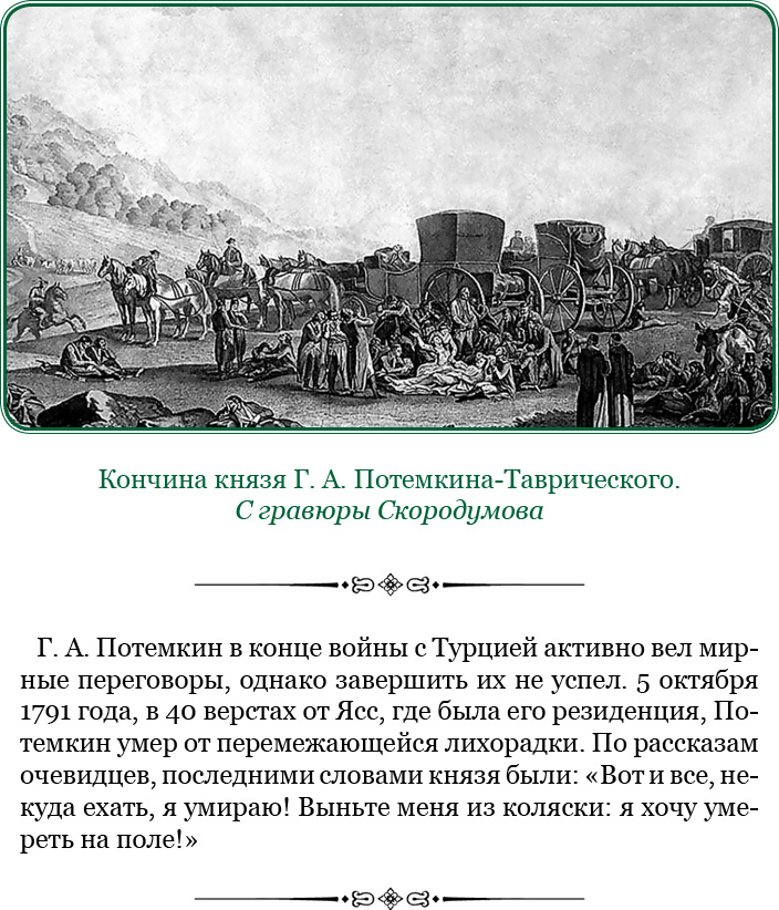 Князь Потемкин-ТаврическийПолучив уведомление о кончине нашего генерал-фельдмаршала князя Потемкина-Таврического, о которой тем паче мы сожалеем, чем известнее нам были его горячее к нам усердие и рвение на пользу отечества и славу нашу, оказанный пред светом знаменитыми заслугами нам и государству, признали мы за благо начальство над армиею нашею, под его предводительством бывшею, и над флотом Черноморским до назначения главного начальника, вверить вам.