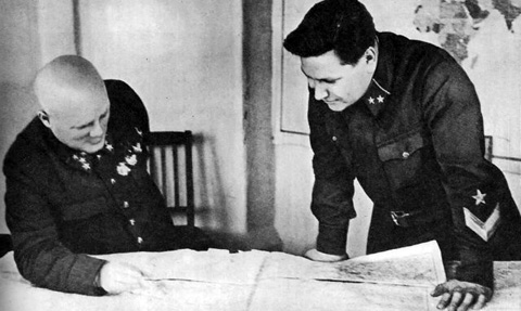 Возле карты командующий Воронежским фронтом Ф. И. Голиков и начальник политического управления фронта С. С. Шатилов.