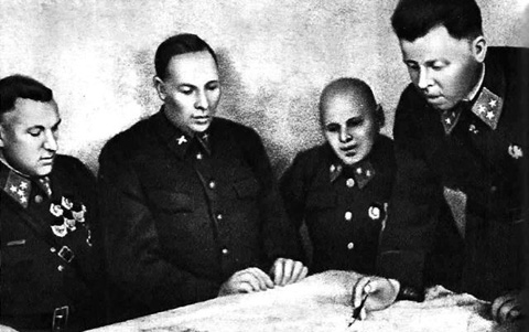 В штабе Донского фронте. Слева направо: командующий фронтом К. К. Рокоссовский, представитель Ставки ВГК Н. Н. Воронов, член Военного совета К. Ф. Телегин, начальник штаба М. С. Малинин.
