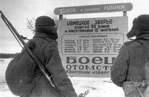 Советские солдаты перед плакатом, сообщающим о зверствах немцев